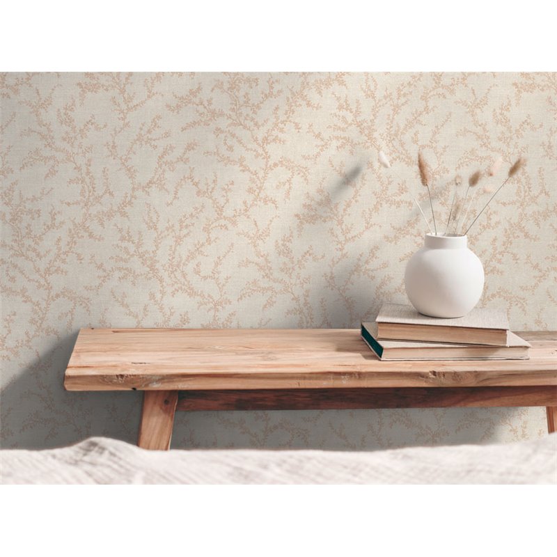 Motif scandinave avec branches en beige, un papier peint idéal pour la chambre favorisant une ambiance naturelle et apaisante. Papier peint intissé, rouleau de 53 cm x 10 m.