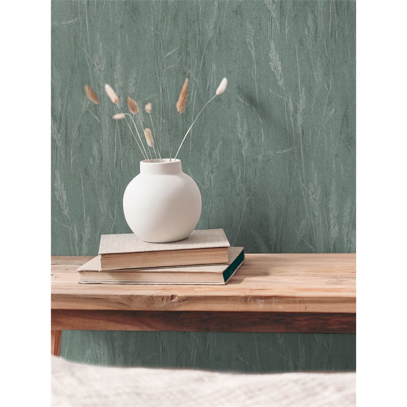 Design scandinave de fleurs sauvages en vert, un papier peint idéal pour le salon à l’esprit naturel et accueillant. Papier peint intissé, rouleau de 53 cm x 10 m.