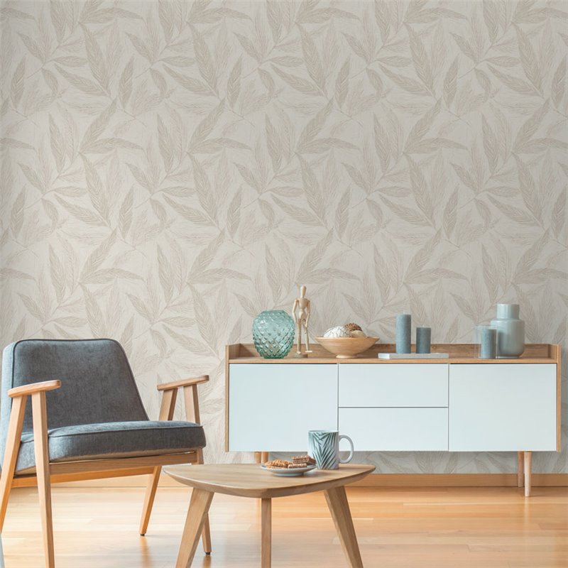 Design nordique de grandes feuilles en beige, un papier peint pour le salon à l’ambiance chaleureuse et naturelle. Papier peint intissé, rouleau de 53 cm x 10 m.