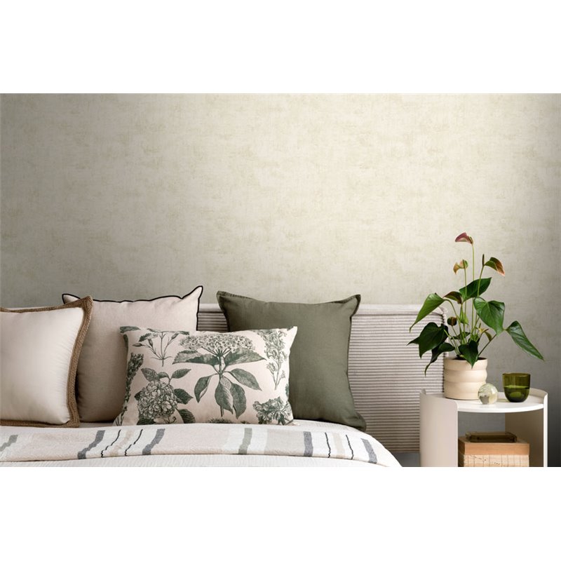 Une teinte blanc beige et un effet stucco créent un fond lumineux et doux, faisant de ce papier peint un choix idéal pour la chambre.
