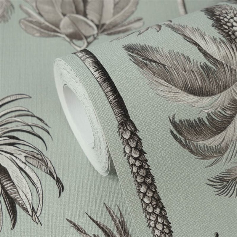 Le style colonial de palmiers vert sauge confère à ce papier peint élégance et caractère pour le salon.