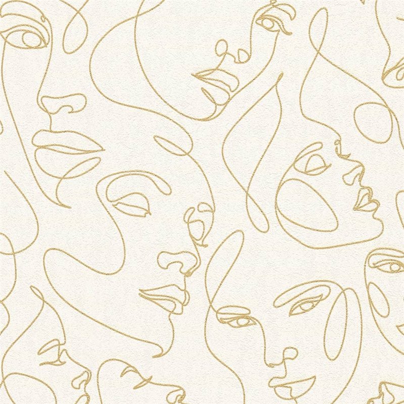 Un motif moderne de visages cubistes blanc et doré apporte sophistication à ce papier peint, idéal pour le restaurant.