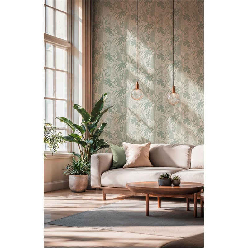 Les tons verts et le dessin de plantes tropicales renforcent l’atmosphère fraîche et végétale de ce papier peint pour l’hôtellerie.