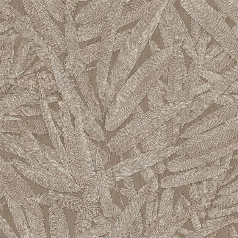Dans les salons de style colonial, ce papier peint aux feuilles exotiques marron clair introduit chaleur et un esprit voyageur.