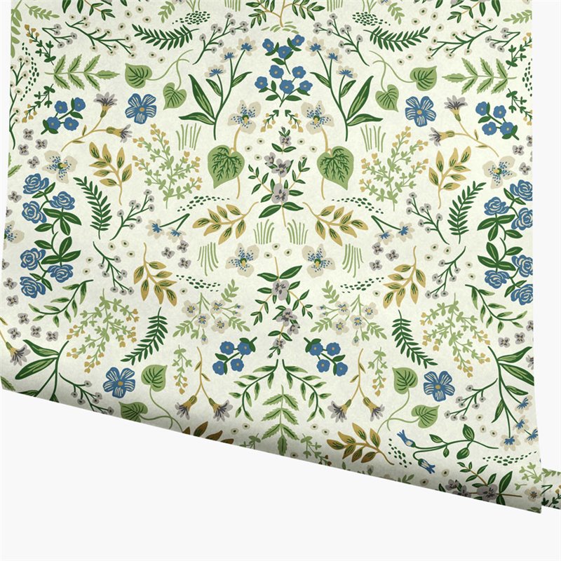 Motif botanique de petites fleurs en blanc créant une ambiance légère et équilibrée ; papier peint idéal pour une décoration douce.