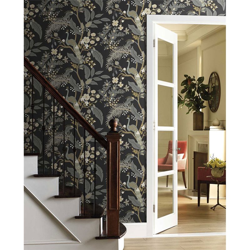 Papier peint floral élégant paons noir