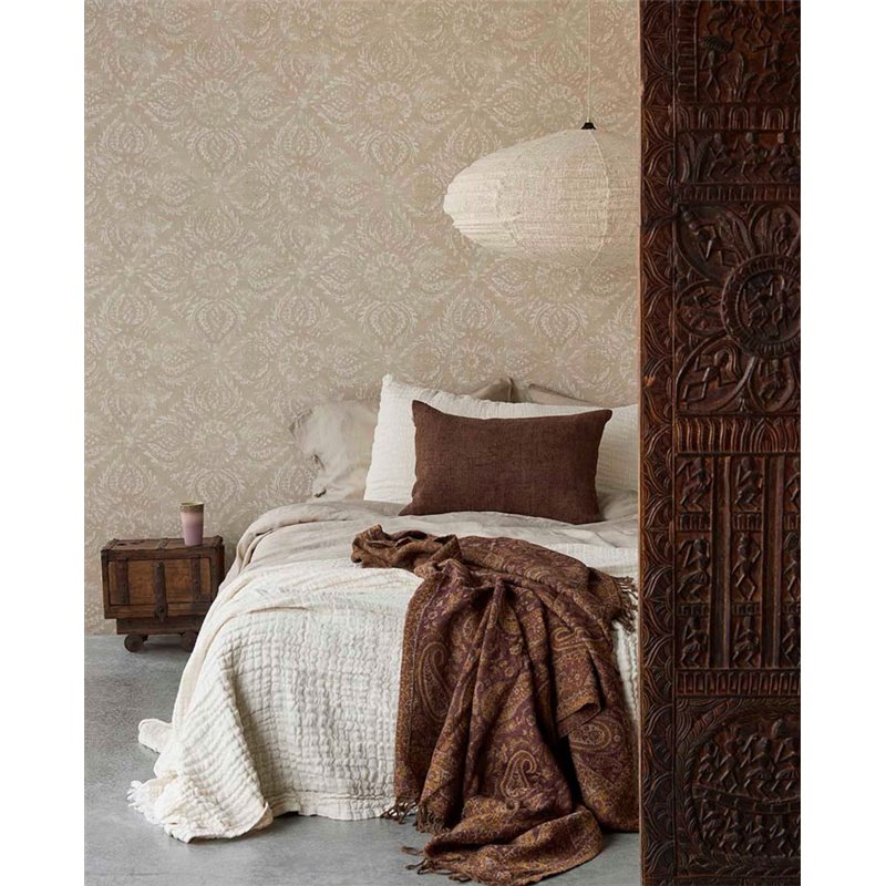 Papier peint à motif arabesque inspiré de motifs de carreaux patinés en beige, idéal pour créer une atmosphère sereine et élégante dans la chambre.