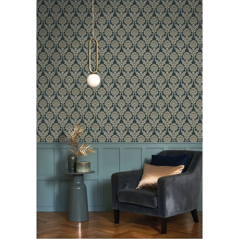 Damassé ornemental bleu en papier peint d’inspiration baroque classique, adapté au salon.
