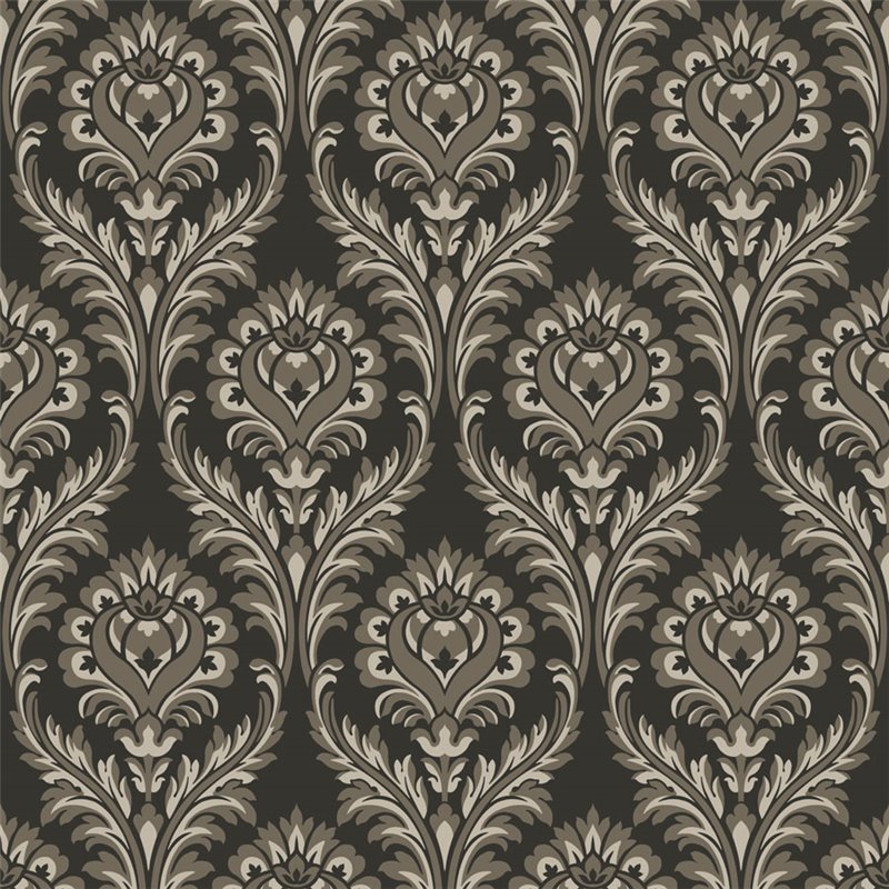 Un papier peint damassé ornemental noir de style baroque classique, recommandé pour chambre.