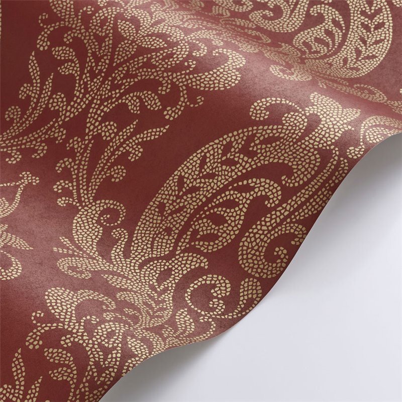 En style classique, ce papier peint damassé arabesque rouge associe motifs damassés et arabesques.