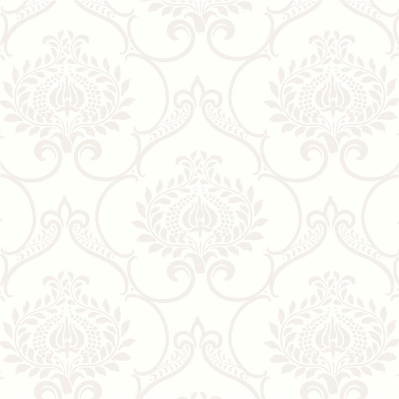 Un papier peint damassé blanc de style classique avec brillance métallisée, idéal pour chambre.