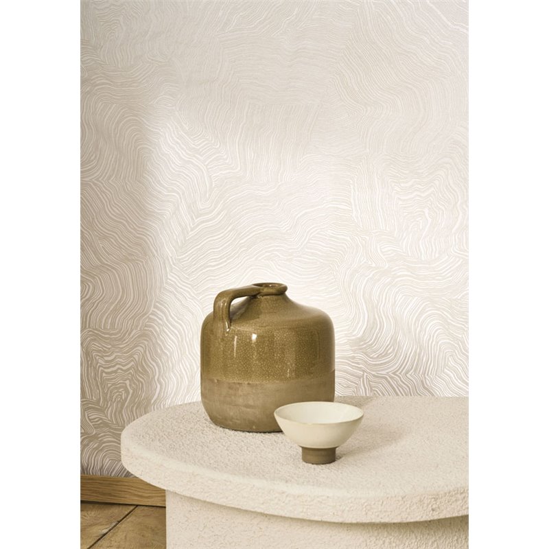 Un papier peint abstrait ondulé beige de style moderne minimaliste avec brillance métallisée, idéal pour entrée, boutique, centre esthétique et spa.